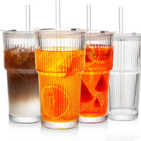 ถ้วยกาแฟแก้วลายแถบขนาด500มล. แก้วใสสำหรับดื่มน้ำผลไม้นมชากาแฟเย็นพร้อมฝาและหลอดบรรจุอย่างปลอดภัย